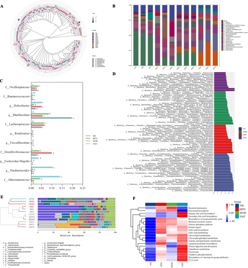3. 重塑肠道菌群结构并富集关键益生菌 通过 16S rRNA 测序,研究发现 HFD 导致小鼠肠道菌群多样性受损,而 ISO 干预显著逆转了这一趋势。在属水平上,ISO 显著增加了 Lachnospiraceae(毛螺菌科)、Oscillospiraceae(震荡螺菌科) 和 Ruminococcaceae(瘤胃菌科) 等有益菌的丰度。这些菌群的改变为后续胆汁酸池的重塑提供了生物学基础。