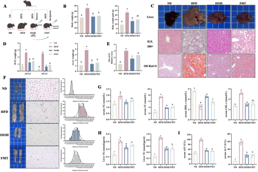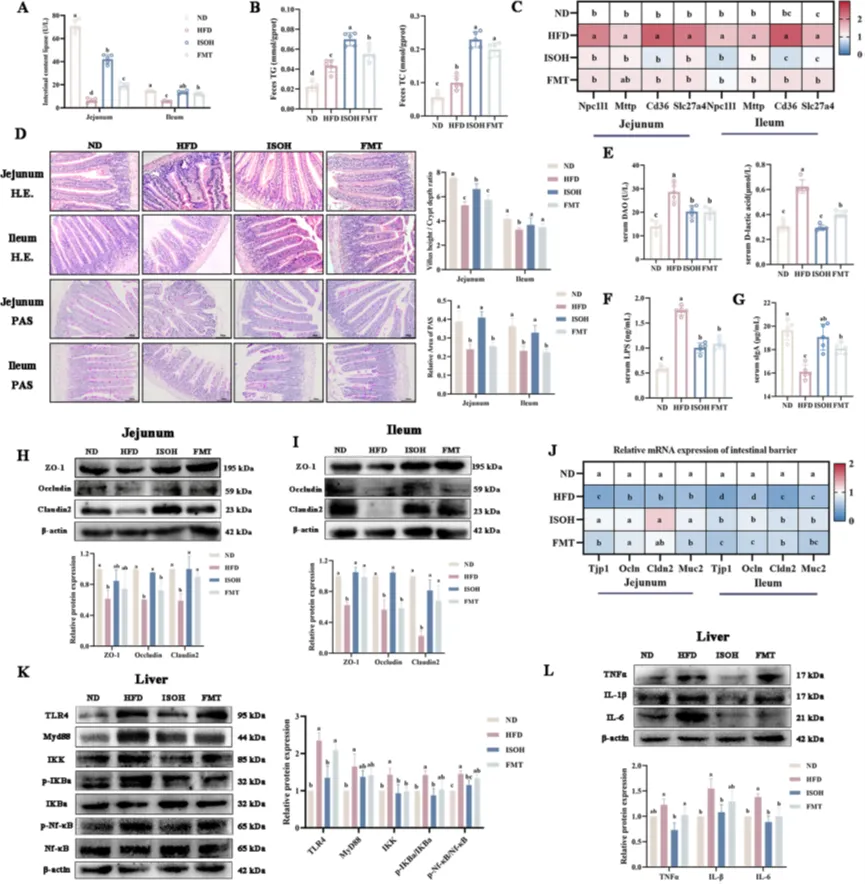 5. 粪菌移植(FMT)验证菌群的中介作用 为证实肠道菌群是 ISO 发挥疗效的核心环节,研究者将 ISO 处理组小鼠的粪便移植给 MASLD 小鼠。结果显示,接受“ISO 菌群”的小鼠同样表现出肝脏脂肪变性减轻、肠道屏障增强(ZO-1 表达增加)以及全身炎症水平下降。这有力证明了 ISO 的代谢获益在很大程度上是由其诱导的肠道微生态改变介导的。