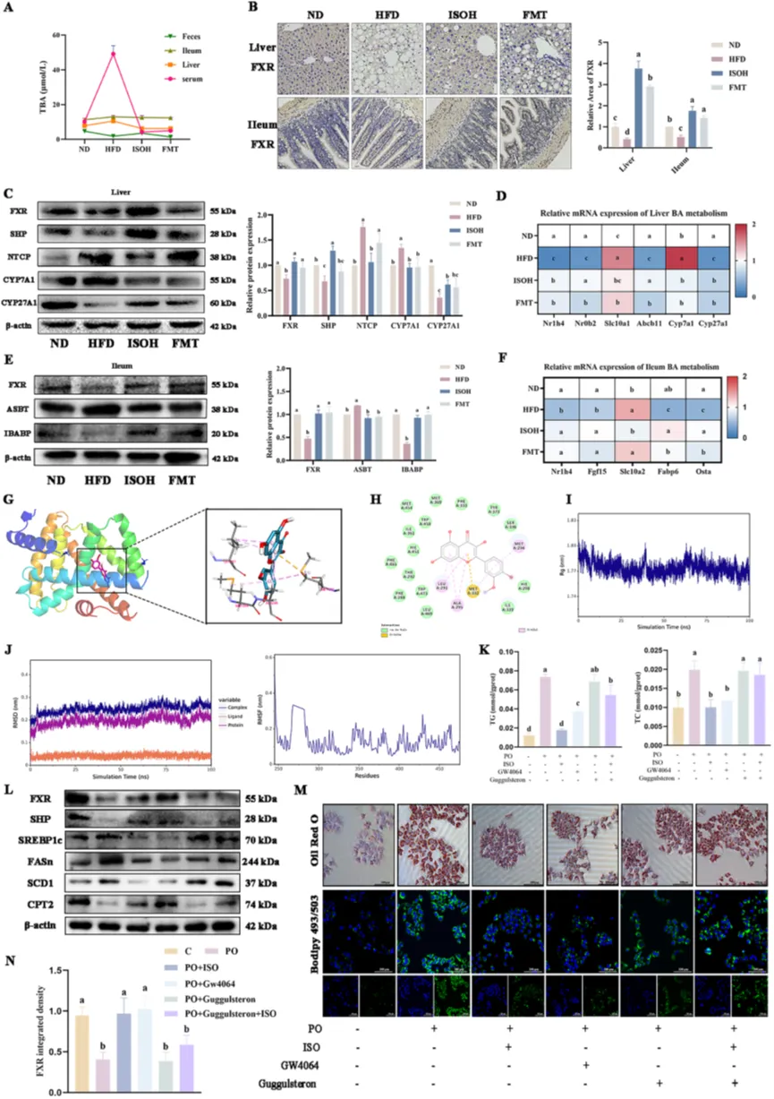 6. 分子对接与体外实验证实 ISO 与 FXR 的直接相互作用 除了通过菌群间接调节,研究团队还通过分子动力学模拟发现,ISO 分子能与 FXR 蛋白的配体结合域形成稳定的氢键结合。随后的体外双荧光素酶报告基因实验进一步证实,ISO 能够直接增强 FXR 的转录活性,证明 ISO 是一种天然的 FXR 激动剂。