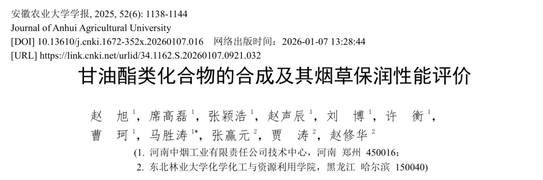 ZHAO X, XI G L, ZHANG Y H, et al. Synthesis of glycerol derivatives and evaluation of their moisturizing performance in tobacco[J]. Journal of Anhui Agricultural University, 2025, 52(6): 1138-1144.