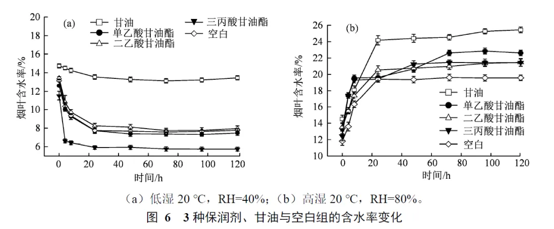摘 要:【目的】延长烟草在潮湿环境下储存周期,减弱传统保润剂中强吸水基团与水的相互作用。【方法】引入脂肪酸类基团与羟基结合,形成甘油酯类化合物,并与甘油的防潮保润性能进行了对比研究。通过核磁共振波谱、傅立叶红外光谱及Zeta电位测试等,验证了甘油酯类化合物的结构及其稳定性;通过不同保润剂对烟叶进行表面改性,分析了甘油酯类化合物对烟叶防潮保润性能的影响,并通过微观形貌表征阐明了甘油酯类化合物的防潮保润机理。【结果】48 h水分吸附性能测试表明,在低湿度(RH = 40%)下,甘油酯类化合物能够降低烟草失水速率,提供保润能力;在高湿度(RH = 80%)下,甘油酯类化合物平衡含水率远低于甘油,能够防止烟草在潮湿环境下变质。【结论】揭示了甘油酯类化合物在未来烟草工业中潜在应用前景,并对甘油酯类化合物进一步研究和应用提出了展望和建议。