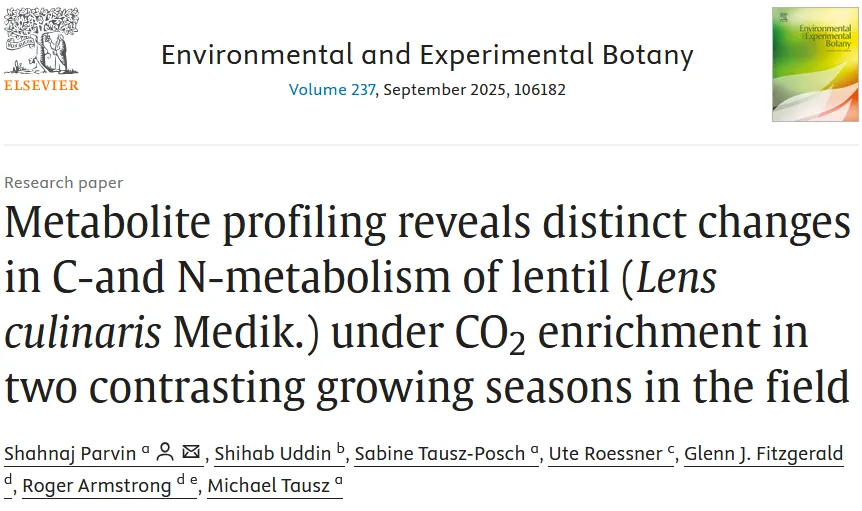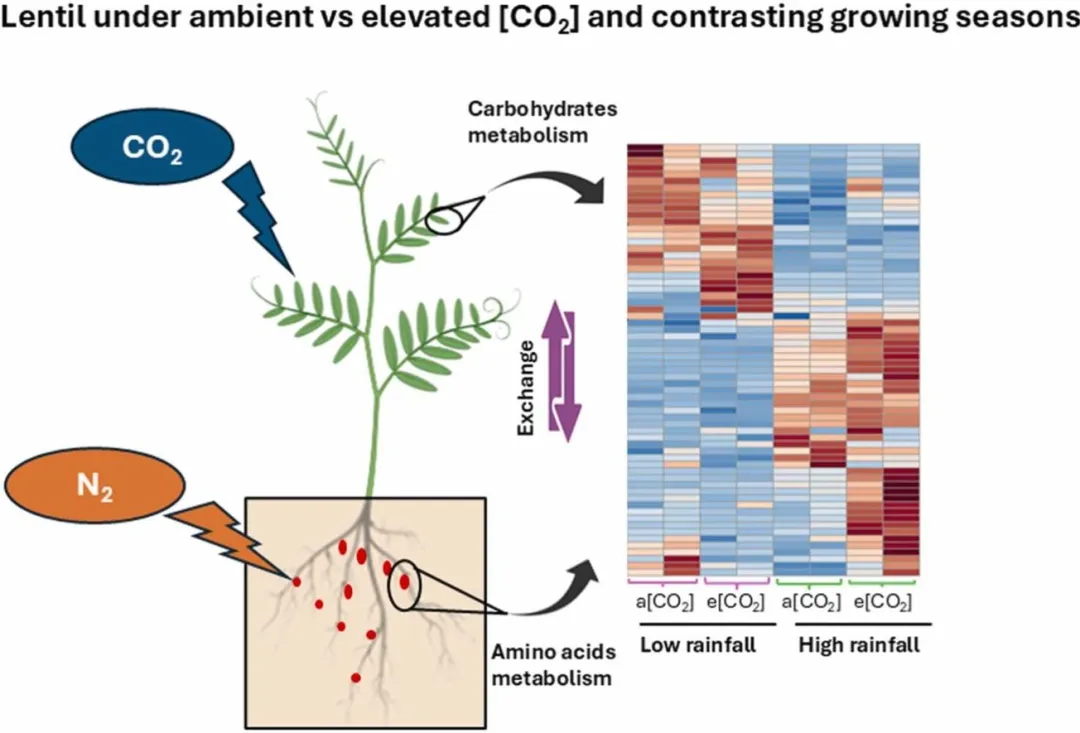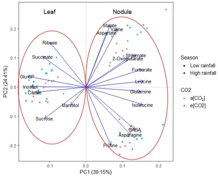 研究人员在澳大利亚Horsham的AGFACE(澳大利亚谷物 FACE)平台,于2015年低降雨季(生长季降雨量 109mm)和2016年高降雨季(生长季降雨量 227mm)开展扁豆大田试验,设置大气 CO₂浓度(a [CO₂],~400μmol mol⁻¹)和升高 CO₂浓度(e [CO₂],~550μmol mol⁻¹)两个处理,选用PBA Ace和HS3010两个扁豆基因型,采用完全随机区组设计,4 次重复。在扁豆开花期(碳、氮代谢最活跃阶段)采集功能叶和活性根瘤样品,通过GC-QqQ-MS和LC-QqQ-MS对代谢物进行定性和定量分析,结合PCA、层次聚类、代谢通路分析等手段,解析降雨季节、CO₂浓度对扁豆不同组织代谢谱的影响。