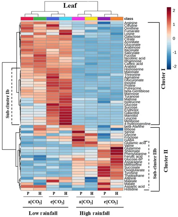 图2 两种扁豆基因型在不同CO₂浓度及降雨季条件下叶片的代谢物层级聚类热图