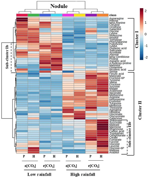 图3 两种扁豆基因型在不同 CO₂浓度及降雨季条件下根瘤的代谢物层级聚类热图