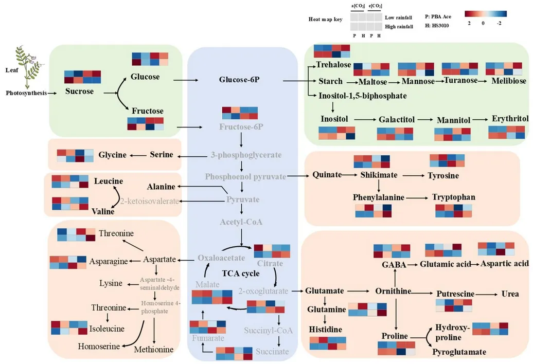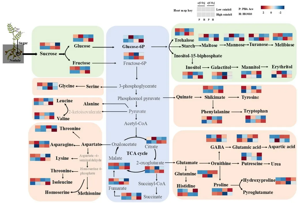 根瘤代谢物的聚类模式与叶片相似,但代谢响应存在组织特异性:低降雨季根瘤中脯氨酸、肌醇、半乳糖醇等胁迫代谢物丰度升高,e [CO₂] 进一步促进了谷氨酰胺、脯氨酸等含氮胁迫代谢物的积累,而葡萄糖、果糖等糖类,以及 TCA 循环中间产物、多数蛋白源性氨基酸含量显著降低,表明低降雨季e [CO₂] 下根瘤碳供应不足,固氮相关代谢受抑;高降雨季e [CO₂] 下根瘤蔗糖、葡萄糖等糖类含量升高,TCA循环中间产物和蛋白源性氨基酸合成激活,根瘤碳供应充足,固氮代谢活跃(图3)。