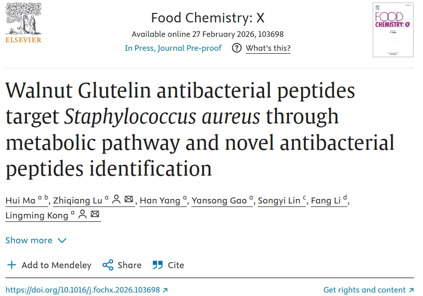 近日,新疆农业大学的研究团队在食品权威期刊《Food Chemistry: X》(IF=8.2)发表题为“Walnut Glutelin antibacterial peptides target Staphylococcus aureus through metabolic pathway and novel antibacterial peptides identification”的研究性论文。该论文由新疆农业大学食品科学与制药学院、大连理工大学食品科学与工程学院及新疆工业技术学院完成,孔令明教授为该论文的通讯作者。