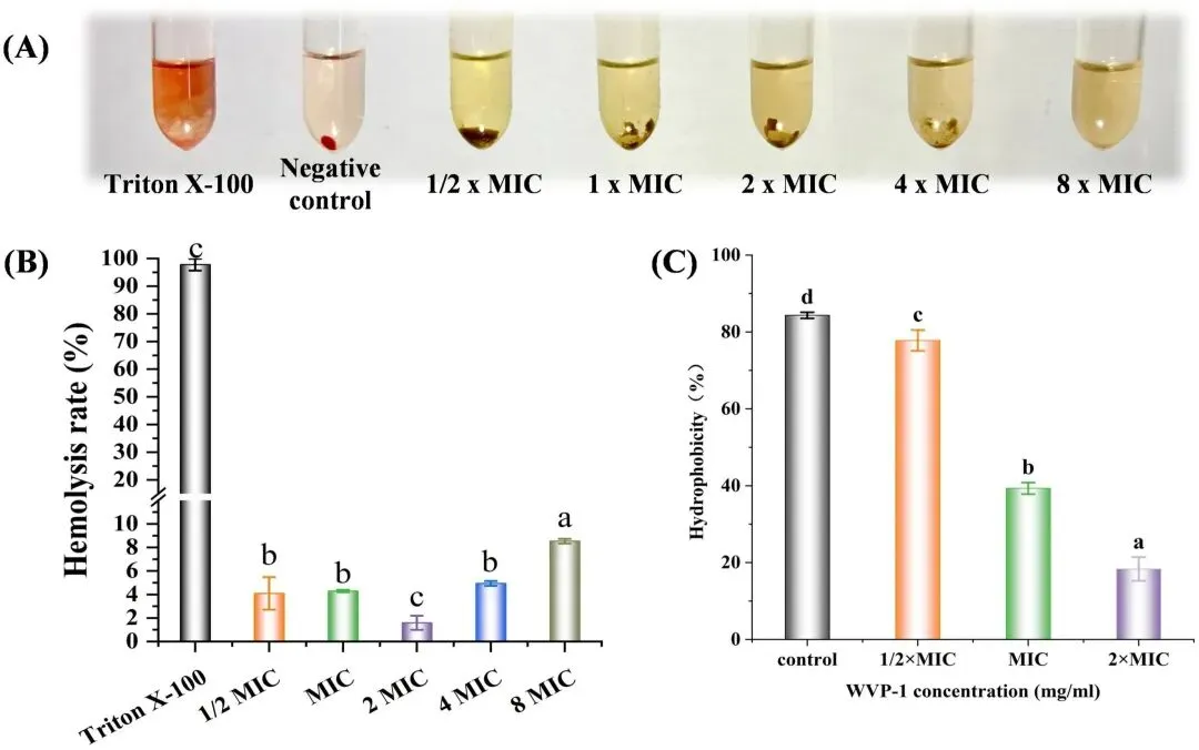 图2 WGAP对溶血毒性及抗菌特性的影响。(A) WGAP在不同最小抑菌浓度下的溶血毒性代表性图像;(B) WGAP在不同最小抑菌浓度下的溶血毒性统计数据;(C) WGAP在不同最小抑菌浓度下的表面疏水性。标注不同字母的组间数据存在显著差异(P<0.05)。