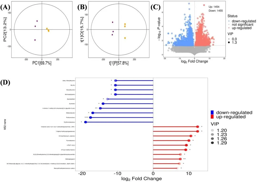 图3金黄色葡萄球菌的多变量统计分析与差异代谢物分析。(A) 模型组与WGAP组的PCA评分散点图;(B) 模型组与WGAP组的OPLS-DA评分散点图; (C) 差异代谢物火山图分析,其中红色与蓝色点分别代表显著上调与下调的代谢物;(D) 差异代谢物中差异倍数最高与最低的前10种代谢物的火柴棒图。(图例中颜色标识的解释请参阅本文网络版。)