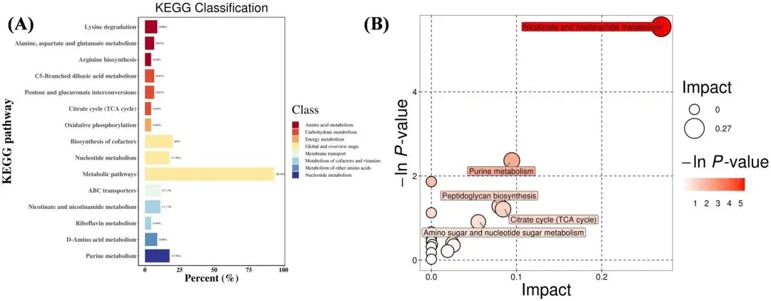 图4 WGAP对KEGG代谢通路分析的影响。(A)模型组与WGAP组的KEGG分类图,横轴表示特定KEGG通路中注释差异代谢物占所有注释差异代谢物的百分比,纵轴表示富集的KEGG代谢通路名称;(B)代谢通路分析的矩形树状图。