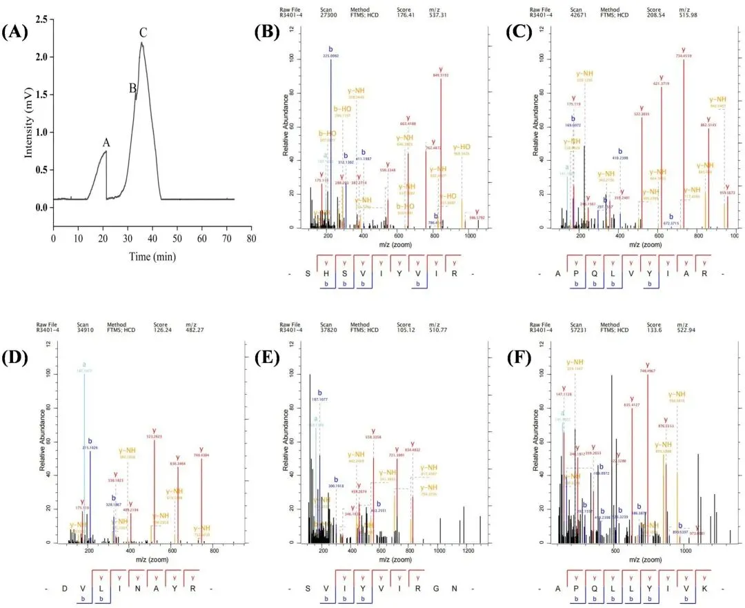 图5 WGAP抗菌肽的鉴定。(A)通过凝胶过滤色谱分析WGAP-III组分;(B)APQLVYIAR、SHSVIYVIR、APQLLYIVK、DVLINAYR和SVIYVIRGN的二次质谱图。