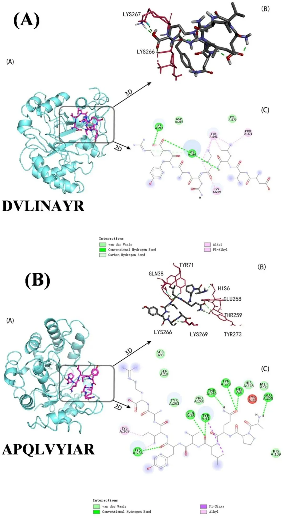 图6 肽与Nfo的分子对接。(A)DVLINAYR与Nfo的分子对接相互作用;(B)APQLVYIAR与Nfo的分子对接相互作用。