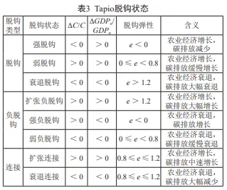 式中:e代表脱钩弹性,ΔC和ΔGDPn分别表示农业碳排放和农牧业产值变化量,C和GDPn分别代表农业碳排放和农牧业产值。根据弹性值的大小,将脱钩状态进一步细分为强脱钩、弱脱钩、衰退脱钩、扩张负脱钩、强负脱钩、弱负脱钩、扩张连接及衰退连接八种类型,具体类别及相关含义如表3所示[28]。
