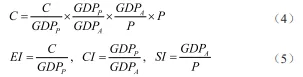 式(4)、(5)中:C为农业碳排放总量;GDPP表示农牧业产值;GDPA表示农林牧渔业总产值;P表示第一产业从业人员数;EI表示农业生产效率,反映单位经济产出所对应的碳排放量;CI表示农业生产结构,为农牧业产值占农林牧渔总产值的比重;SI为农业经济发展水平,表示单位农业劳动力所创造的经济价值[30]。通过对数加和分解等处理,可得到各驱动因素对农业碳排放的贡献值。