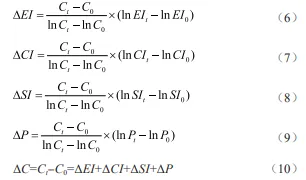 式(6)-(10)中:Ct和C0分别表示t期和基期的农业碳排放量;ΔEI、ΔCI、ΔSI、ΔP分别表示第t期与基期相比,农业生产效率、农业生产结构、农业经济发展水平以及劳动力规模对农业碳排放的贡献值。通过上述各因素相加可得总效应即ΔC。