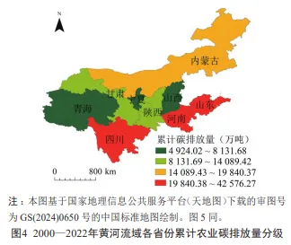 利用自然间断点分级法将黄河流域各省份2000-2022年累计农业碳排放量进行划分,如图4所示。各省份农业碳排放量按累计值排序依次为河南>山东>四川>内蒙古>甘肃>陕西>山西>青海>宁夏。农业碳排放量存在地区性差异,高排放量地区主要集中在黄河中下游地区,山东、河南以及四川的农业碳排放量在研究期内累计值均高达30000万吨以上;其次是内蒙古,累计碳排放量接近20000万吨;甘肃和陕西的累计碳排放量均在10000万吨以上;山西、青海的累计碳排放量均集中在7000万-8200万吨;宁夏累计农业碳排放量最低,仅为4924万吨。其中,山东、河南在研究期内单年农业碳排放量大都超过1500万吨,宁夏单年农业碳排放量最低,主要集中在150万吨。