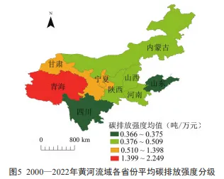 黄河流域各省份农业碳排放强度均值如图5所示,可以发现其大致呈现西高东低的分布格局,平均碳排放强度排序依次为青海>宁夏>甘肃>山西>内蒙古>河南>陕西>山东>四川,研究期内各省份农业碳排放强度均呈现波动下降趋势。黄河流域2000-2022年平均碳排放强度为0.796吨/万元,青海、宁夏及甘肃的碳排放强度均高于均值。山西、内蒙古和陕西的农业年碳排放量及农牧业产值在黄河流域九省份中均处于中等水平,农业碳排放强度也处于中等水平。山东、四川农业发达且高效,因而碳排放量高但强度低。而青海碳排放量低,碳排放强度大,青海农业因耕地面积有限、农业总产值规模小导致总碳排放量低,而生态环境约束下农业生产效率偏低、单位产出能耗相对较高,未来要更加注重农业减排以及发展特色农业。