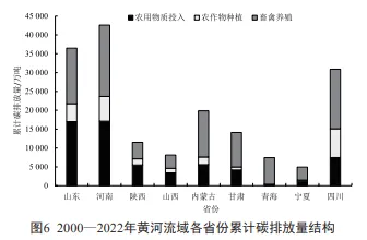 黄河流域各省份2000-2022年累计农业碳排放量结构如图6所示。可明显看出,河南无论是整体还是分结构农业碳排放量均较为突出。具体来看,在农用物质投入和农作物种植方面,河南、山东作为我国农业大省,自然资源优越,水热条件适宜,农作物种植面积以及产量均较多,相应的农用物质投入规模较其他省份投入多,进而碳排放量高。由于自然条件限制,青海、宁夏等地农业耕地规模有限,农用物质投入强度小,造成相应的农作物种植和农用物质投入碳排放量较低。在畜禽养殖方面,河南碳排放量最多,2000-2022年累计碳排放量18000万吨,与其农村地区养殖需求和农业资源丰富有关。宁夏碳排放量最低,仅累计3400万吨。