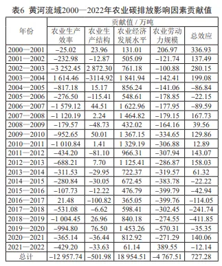 利用LMDI模型将黄河流域农业碳排放的影响因素划分为农业生产效率、农业生产结构、农业经济发展水平和农业劳动力规模四个方面,计算2000-2022年各因素对农业碳排放的贡献值,结果如表6所示。从整体上看,研究期内黄河流域在各因素的驱动作用下,农业碳排放达727.28万吨,其中农业经济发展水平对农业碳排放具有较强推动作用,而农业生产效率、农业生产结构和农业劳动力规模对农业碳排放整体起到抑制作用。