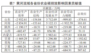 利用LMDI模型计算黄河流域九省份2000-2022年各影响因素贡献值,如表7所示。从整体来看,黄河流域各省份农业经济发展水平均表现为农业碳排放的增排因素,在碳减排方面,农业生产效率>农业劳动力规模>农业生产结构。