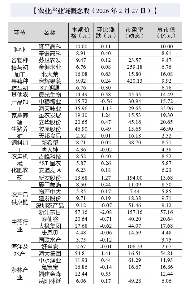 《方案》提出,“人工智能+南繁种业”的重点任务主要包括:整合科研育种相关数据库,构建农作物“基因—环境—表型”育种大数据平台;打造一批集中连片稳定的数字化、智能化的南繁科研育种用地,打通实验室到田间“最后一公里”;建设种业大模型,整合海量育种数据,开发植物基因编辑效果AI预测模型,缩短育种周期;应用无人机巡田与水肥AI调控,形成可复制推广的智慧种植标准。近日,嘉吉公司与以色列细胞农业企业Kokomodo合作,推进细胞培养巧克力解决方案,在气候变化压力下,探索替代可可原料。据悉,Kokomodo公司通过细胞培养技术生产功能性可可原料,在保留可可天然风味与生物活性成分的同时,提升原料供应的全年稳定性与可持续性。2月23日,ADM发布表示,瞄准特种营养品市场,推进无过敏原豌豆蛋白的创新应用,包括超高蛋白饮料、蛋白棒及功能性零食等高附加值品类。公司认为,随着消费者对蛋白质摄入质量与来源的关注提升,该细分市场有望保持稳健增长。近日,食品巨头通用磨坊发布2026年计划,预计相关产品创新围绕多项“宏观趋势”展开,包括美国人口老龄化、对性价比的高度关注、健康与养生需求上升、体重管理优先级提升、宠物“拟人化”趋势,以及人工智能与数字化融合。日前,中化数智科技有限公司更名揭牌。该公司依托于中国中化的数智化转型实践,建立起从咨询、设计到研发、交付及运维的服务价值链,致力于推动数智科技与产业深度融合,引领化工、农业行业智能化发展。近日,厦门象屿太平湾植物蛋白加工项目首批核心设备顺利完成吊装。该项目位于大连太平湾港区,总投资约10亿元,规划年油料加工能力达180万吨,将力争在2026年底建成投产,打造北方临港粮油产业发展新高地。6. 秋乐种业:2025年净利润1254.95万元