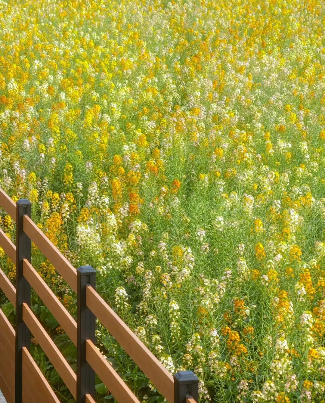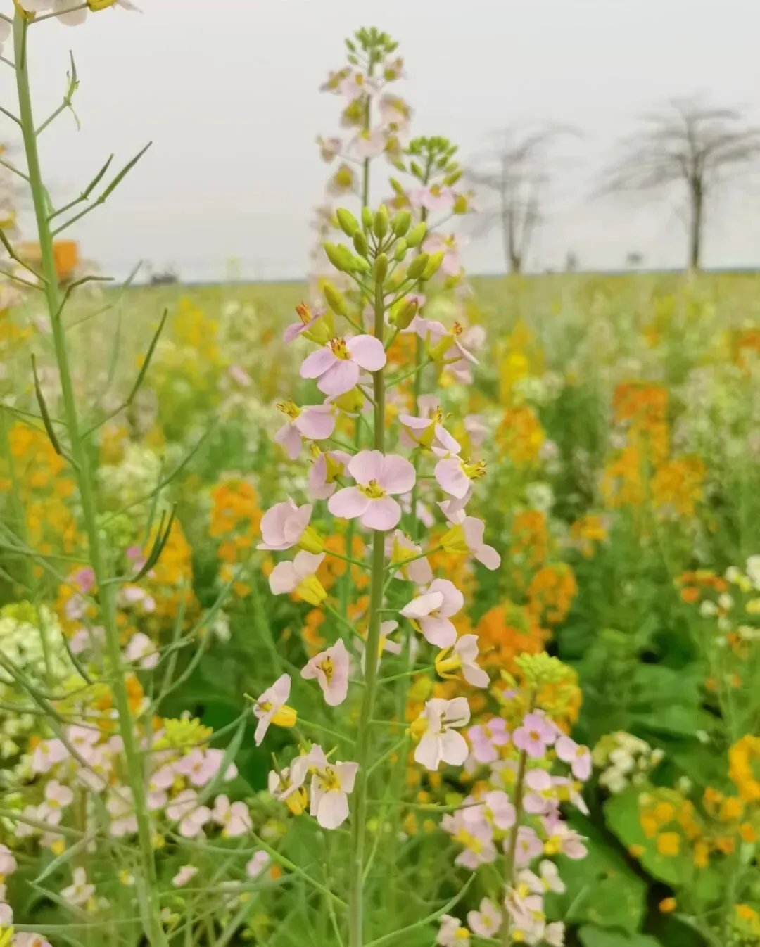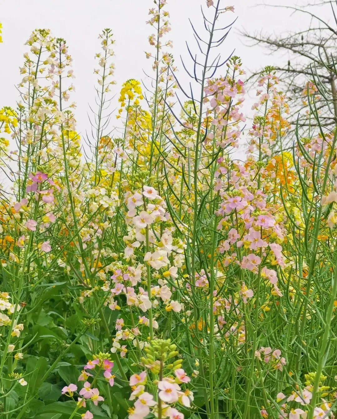 🌸这里的油菜花并非传统的金黄色,而是融入了橙黄、粉色、白色等多种色彩,宛如大自然的调色盘被打翻,绽放出绚烂的色彩。