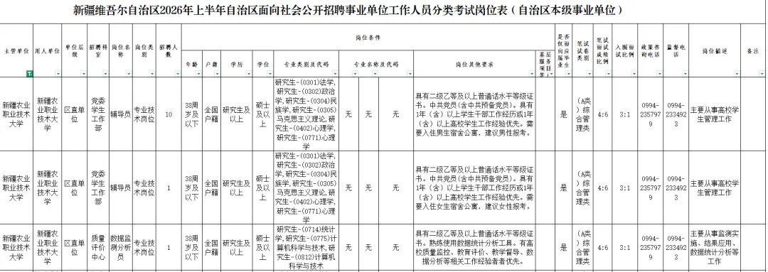 附件1:新疆维吾尔自治区2026年上半年面向社会公开招聘事业单位工作人员分类考试岗位表(下载)