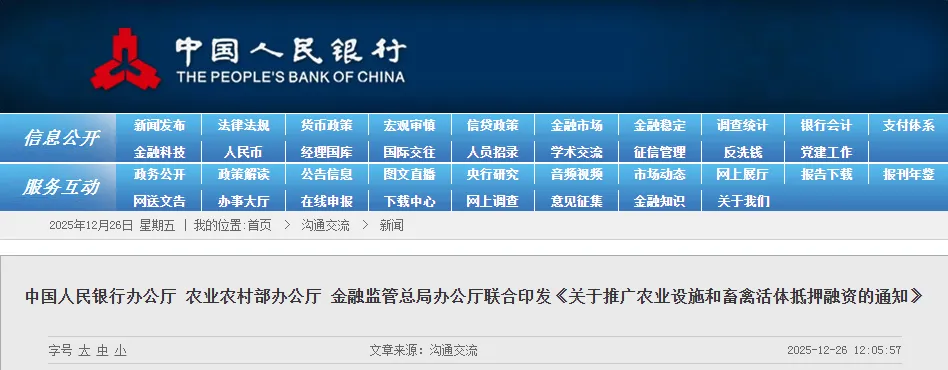 为深入贯彻落实党的二十大和二十届历次全会精神,落实中央一号文件部署要求,深入学习运用“千万工程”经验,创新乡村振兴投融资机制,拓宽农业农村抵质押物范围,盘活农村资源要素,助力推进乡村全面振兴,近日,中国人民银行办公厅、农业农村部办公厅、金融监管总局办公厅联合印发《关于推广农业设施和畜禽活体抵押融资的通知》(以下简称《通知》)。