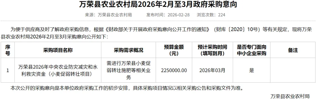 >预算220余万,万荣县2026年中央农业防灾减灾和水利救灾资金(小麦促弱转壮项目)