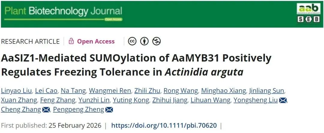 近日,安徽农业大学园艺学院刘永胜/郑朋朋团队在Plant Biotechnology Journal在线发表了题为AaSIZ1-Mediated SUMOylation of AaMYB31 Positively Regulates Freezing Tolerance in Actinidia arguta的研究论文,揭示了转录因子AaMYB31的SUMO化调控软枣猕猴桃抗寒性的新机制。