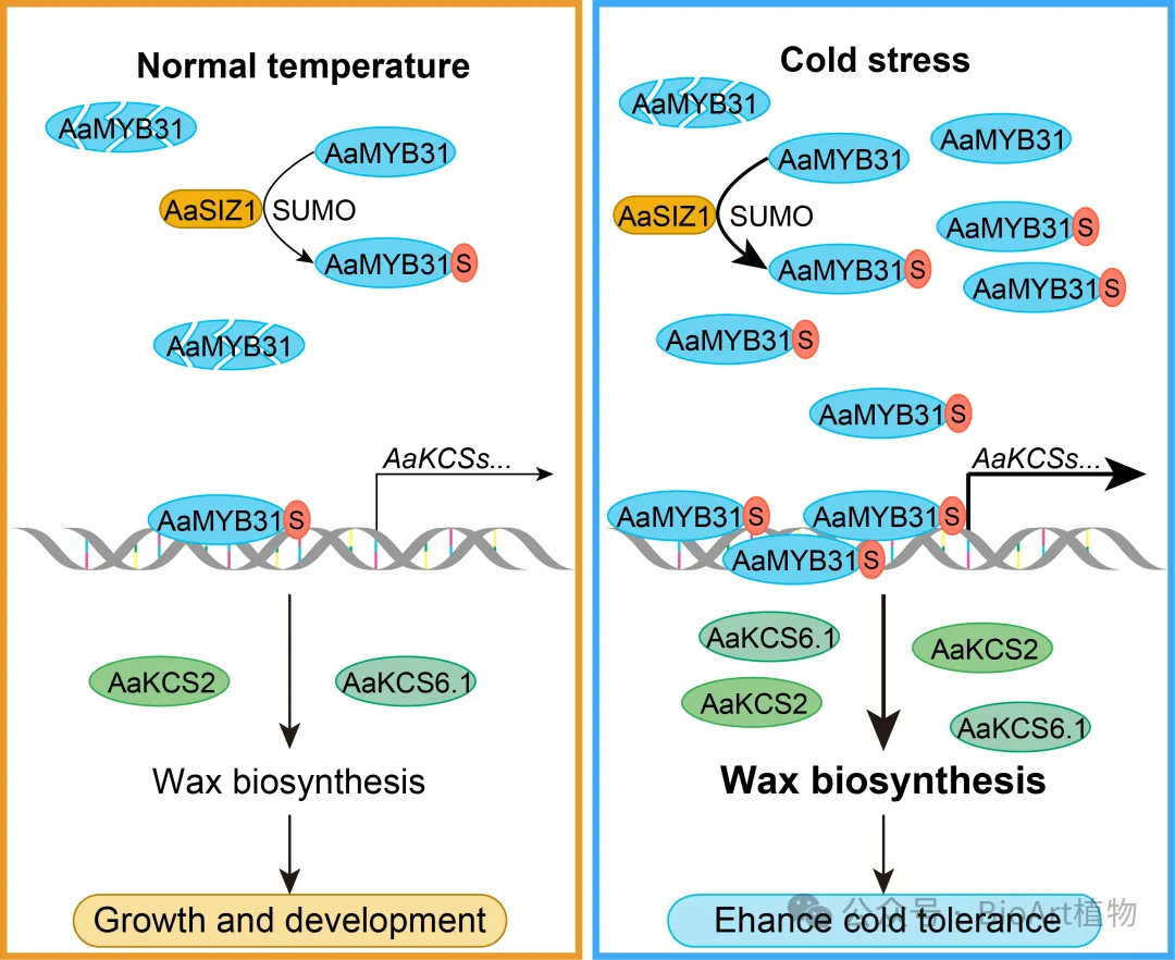 该研究发现,冷胁迫能够诱导软枣猕猴桃蜡质合成基因AaKCSs的上调表达,从而促进软枣猕猴桃的蜡质的合成和沉积,最终提升其冷冻胁迫耐受性。该研究进一步发现,R2R3型MYB转录因子AaMYB31.1和AaMYB31.1在转录水平上受冷胁迫诱导上调表达,并直接与AaKCS2和AaKCS6.1的启动子结合以激活它们的表达,进而促进软枣猕猴桃的蜡质合成并增强猕猴桃的抗冻性。此外,研究团队还发现AaSIZ1与AaMYB31.1和AaMYB31.1互作,并通过介导AaMYB31.1和AaMYB31.1的SUMO化增强它们的蛋白稳定性。值得注意的是,该研究发现冷胁迫显著增强了AaSIZ1与AaMYB31.1和AaMYB31.1的互作以及其介导的AaMYB31.1和AaMYB31.1的SUMO化。