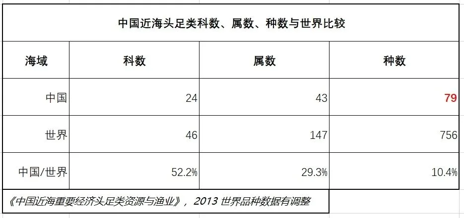 根据最新研究成果,全球头足类品种总数在750-760种,其中中国头足类品种数量为79种,占全球的10.4%,从占比看并不是很多!但中国的79个头足类品种,分布在24个科和43个属,分别占全球头足类科数和属数的52.2%和29.3%。这么看来中国优势还是很明显的:头足类品种虽然不多,但在各个主要品类都有当家品种!