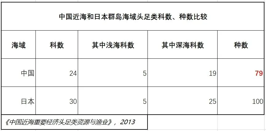日本头足类的种类有100种,中国有79种,品种数量上中国稍逊于日本。在科数上中国24科、日本30科。其中浅海科数中日都是5科;深海科数中国19科,日本25科,日本明显高于中国。