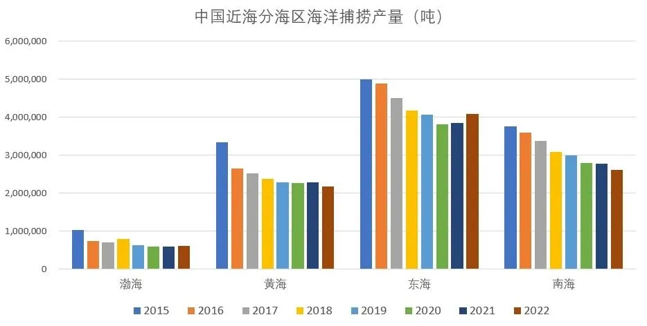 从分海区的海洋捕捞产量看:东海区产量最高(占比43.1%),南海区其次(占比27.5%),黄海区再次(占比23.0%),渤海区最低(占比6.4%)。