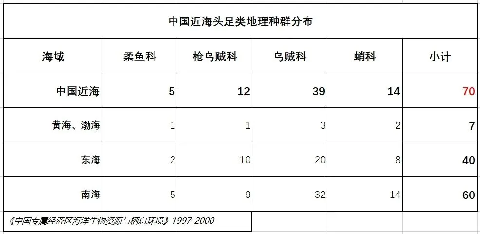 再来看看中国近海头足类资源的分布:根据1997-2000《中国专属经济区海洋生物资源鱼栖息环境调查》结果,中国沿海头足类品种合计70种,南海区60种、东海区40种、黄渤海区7种,呈现出明显的南多北少的格局。
