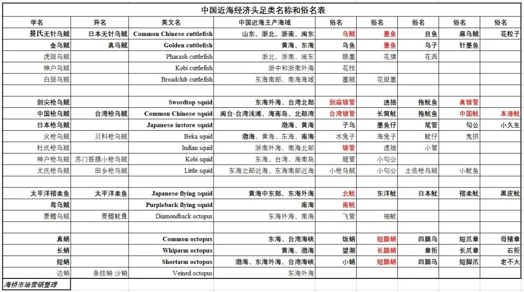 中国常见头足类名称和俗名对照表(海桥营销整理)