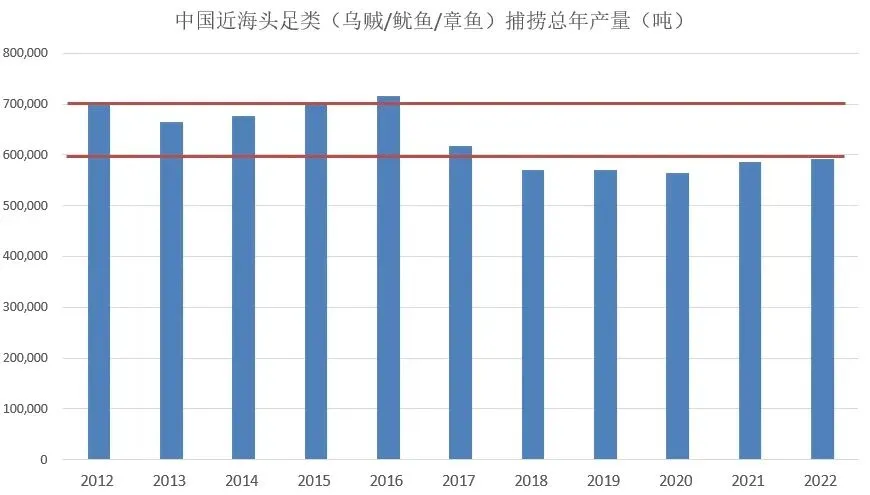 根据《中国渔业统计年鉴》,近十年来中国近海的头足类年产量可以分为两个阶段:2012-2017年基本维持在70万吨左右,2017-2022年基本维持在60万吨左右。看起来捕捞产量并没有减少多少,但实际情况可能没有那么乐观,因为沿海渔民普遍反映近些年鱿鱼墨鱼章鱼越来越少,很难形成鱼汛,市场上也越来越少看到国产的鱿鱼墨鱼和章鱼,鱿鱼进口量反而越来越多:中国鱿鱼渔业简史(1):从近海到远洋,从自捕到进口的全能冠军!