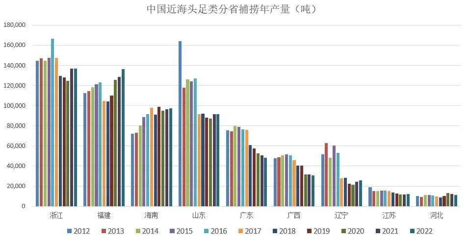 根据《中国渔业统计年鉴》,在沿海各省中,浙江、福建海南、山东是头足类产量较高的省份。浙江的捕捞产量基本稳定,福建和海南的捕捞产量在缓慢增加,山东的捕捞产在逐渐减少。