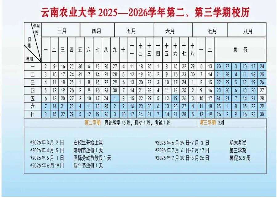 【校历】云南农业大学2025-2026学年第二三学期校历