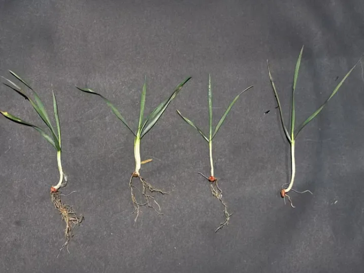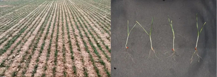 小麦品种为‘马兰6号’,2025年11月6日播种,播量25kg/亩,采用20/12.5cm宽窄行方式种植,未浇越冬水,冬前镇压。目前小麦个体2叶1心,次生根1.2条,总茎数45.3万,为三类苗。干土层4cm,田间未发现病虫草害。