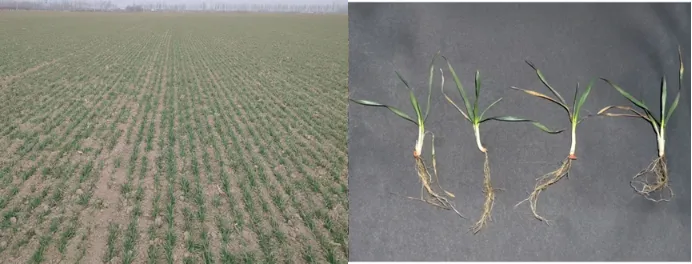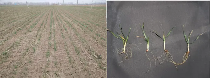 小麦品种是‘马兰1号’和‘马兰6号’,分别于10月28日和10月30日播种,采用20cm等行距种植,播量26kg/亩,冬前漫灌越冬水。‘马兰1号’个体3叶1心,次生根1.5条;总茎数40.7万/亩,为三类苗;‘马兰6号’个体2叶1心,次生根1.4条;总茎数42.3万/亩,为三类苗,土壤墒情较好,但表层裂缝较多。麦田未发现病虫草害。