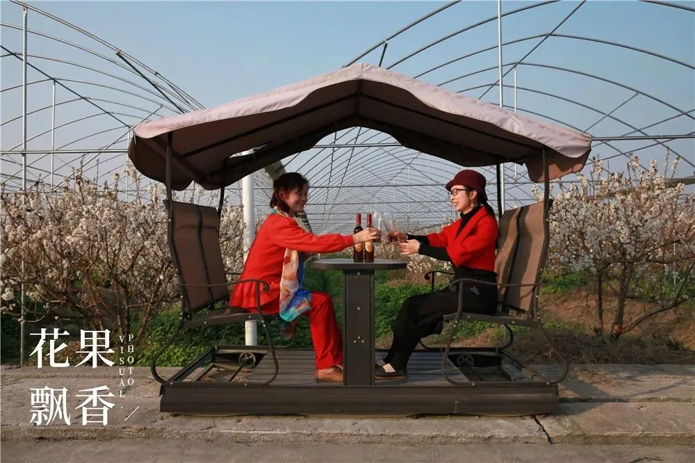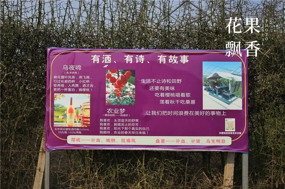 有酒,有诗,有故事,在绍兴樱桃乐园门口的一块宣传牌上写着樱桃姐姐的农业梦。
