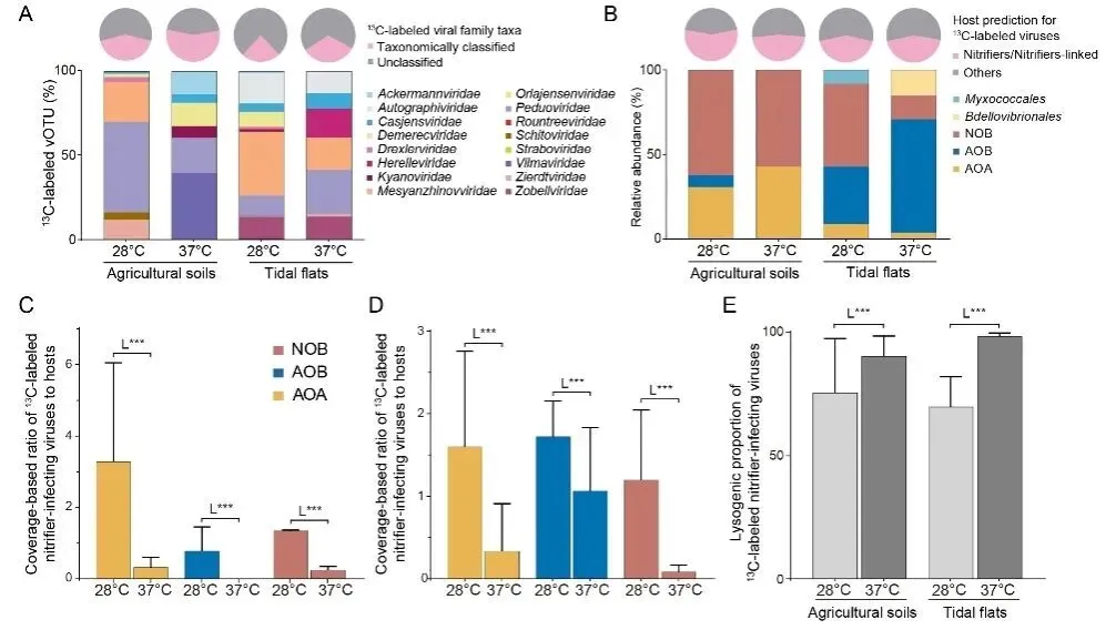 近日,南京农业大学联合美国伊利诺伊大学厄巴纳 - 香槟分校等多家科研机构,在《The ISME Journal》上发表了一项突破性成果。该研究聚焦于长江上游的自然潮滩与邻近农田土壤,通过构建微宇宙培养体系,模拟了仲夏平均温度(28°C)与持续热浪条件(37°C),并创新性地结合13C-DNA稳定同位素标记技术与宏基因组学分析,首次从“活性”层面揭示了热浪如何重塑硝化微生物群落及其病毒互作网络。