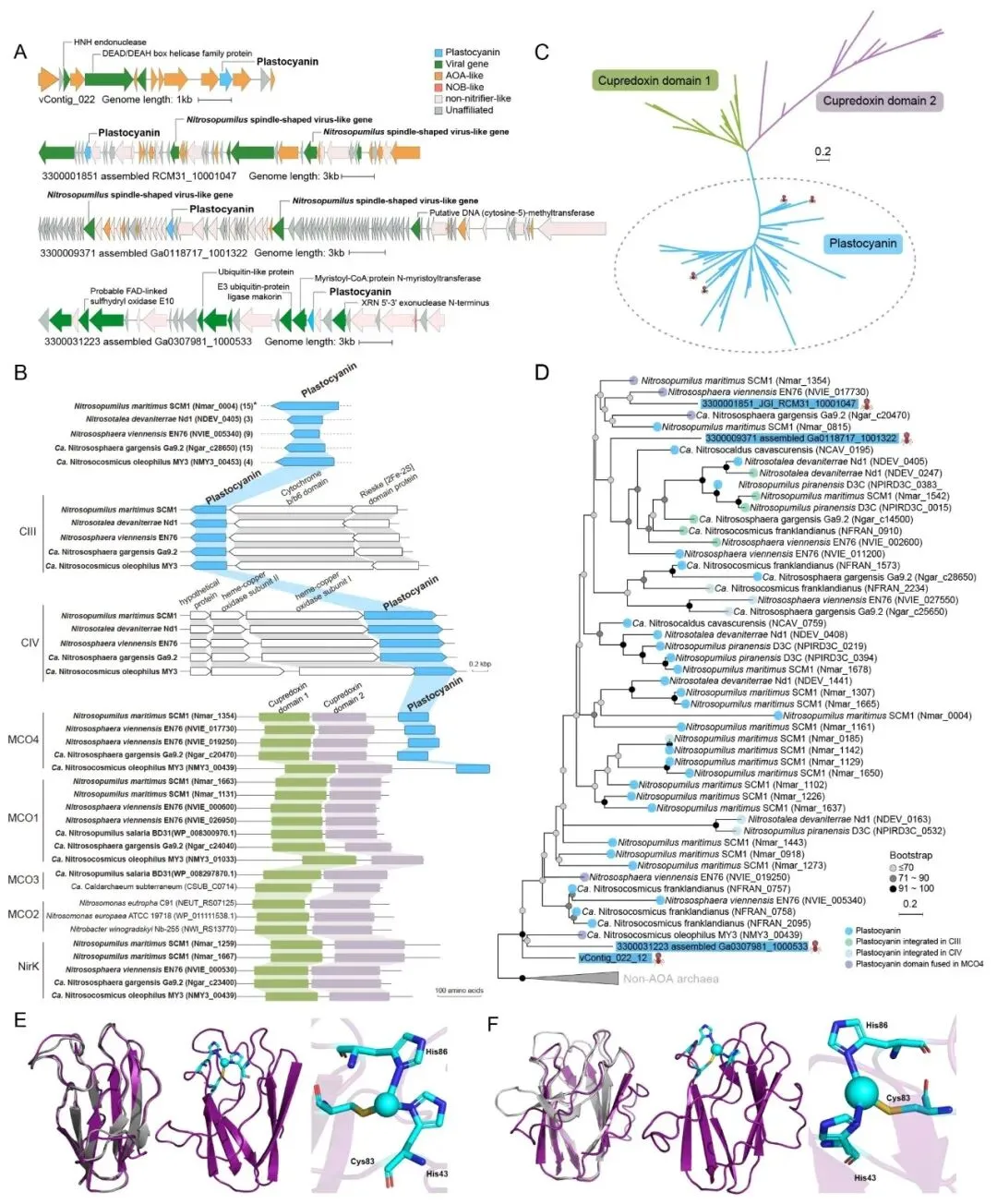 此外,研究团队在侵染AOA的病毒基因组中鉴定出了一种编码质体蓝素(plastocyanin)的辅助代谢基因。该基因编码的蛋白质是AOA呼吸链中关键的铜依赖性电子载体,具有保守的活性位点和稳定的折叠结构,推测能够增强宿主的电子传递效率和能量代谢能力。这一发现暗示,在低温环境下,病毒可能通过携带此类功能基因,在裂解宿主的同时提升其代谢效能,从而精细调控硝化微生物的种群动态与硝化速率;而在高温压力下,病毒转向溶源策略,不再需要对宿主进行额外的能量补偿,而是将资源集中于自身基因组的复制。