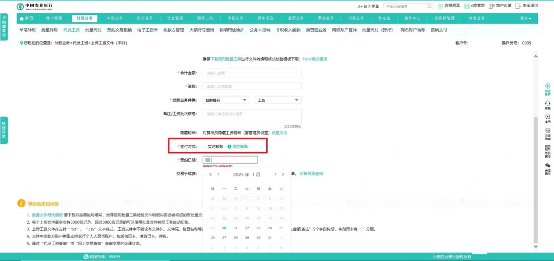 2.操作员A完成代发工资必填项信息录入后,于支付方式一栏选择“预约转账”后,点击“预约日期”栏,即可选择预约发送的日期,目前可支持预约未来90天内的任意一天执行本行代发操作,预约当日上午七点后台开始处理交易。