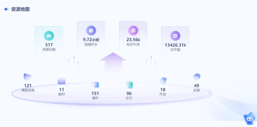 课程建设的核心是优质资源的体系化建设。本课程构建了深度结构化的资源库(图2),累计整合各类资源1350项,已上传文件517个,涵盖电子教材、讲义课件、习题试卷、相关论文等。音视频资源累计时长约9.7小时,并完成了对资源的深度加工,解析字符总量达13426.31k字符,生成知识切片约2.3万个(含公式切片2245个、图片切片3883个、表格切片902个),将抽象知识具象化,覆盖了“备课-学习-实践”全流程。这些资源被整合进课程专属的RAG知识库,形成了强大的数据底座。