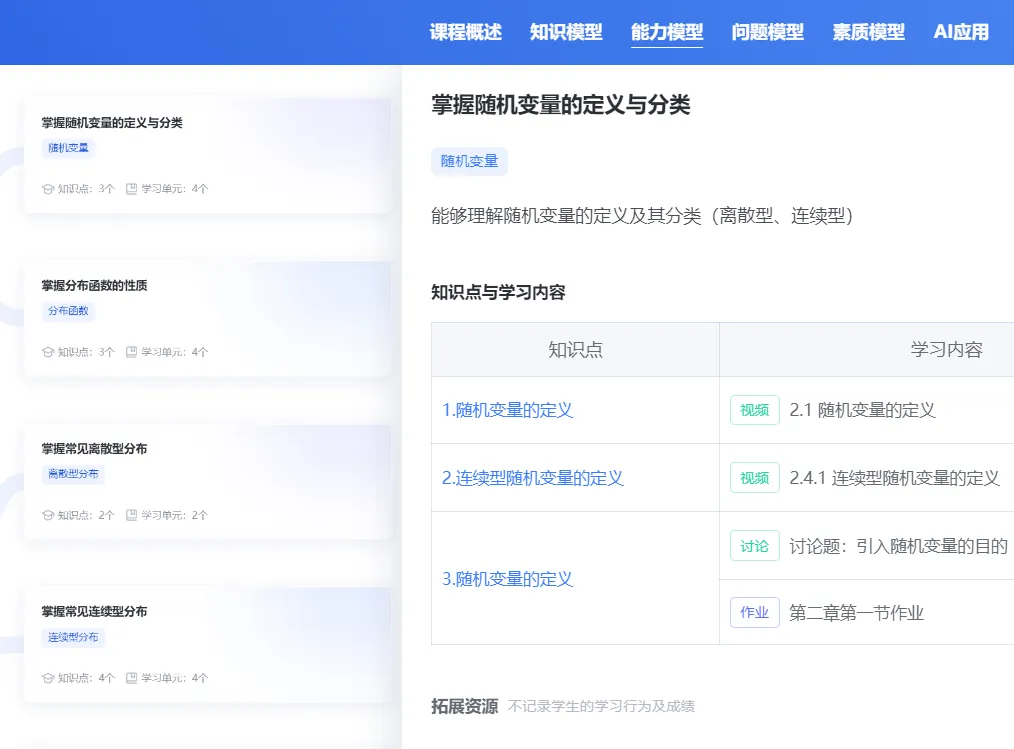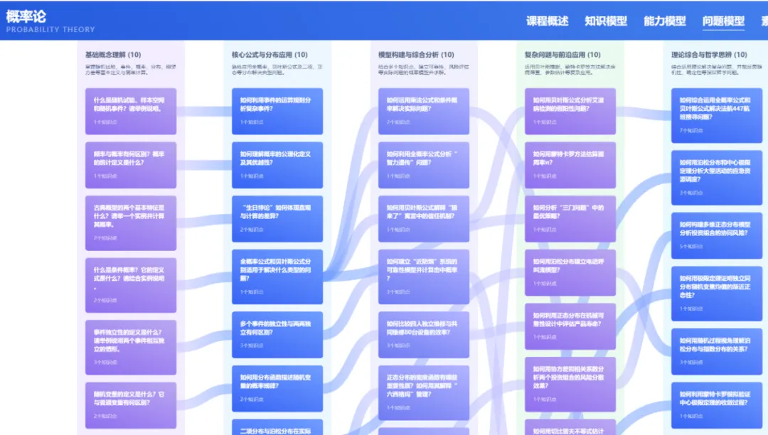 能力与问题图谱设置了22个能力点,明确其与知识点的对应关系;同时梳理了50个概率论学习典型问题,并关联解决方案与配套资源,为学生快速突破难点提供精准导航。