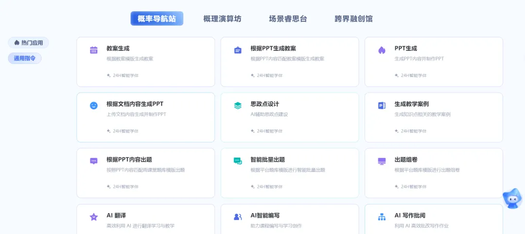 同时,团队开发了覆盖教学全场景的4组AI指令工具(图7和图8)。为教师打造了包含PPT生成、教案撰写、出题组卷、思政设计等功能的“备课通用工具型指令”;为学生构建了具备手写公式识别、公式推导、错题分析、出题自测等功能的“AI学伴通用工具型指令”。此外,还设计了紧密结合学科需求的“课程学习指令”,涵盖概念理解、计算辅助、应用场景与高阶思维等模块,有效降低了师生使用AI工具的门槛。