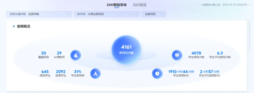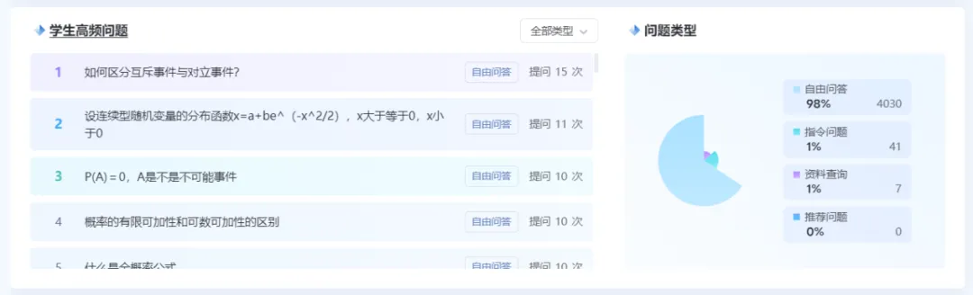 2025-2026第一学期实践数据显示(图9-11),该智慧课程已覆盖2092名学生,累计交互4161次,总使用时长超过1910小时。学生对智能学伴接受度较高,98%的交互为自由问答,基于能力图谱的个性化学习路径和问题图谱的针对性辅导,有效提升了学生的问题解决能力和自主学习能力。展望未来,课程团队计划基于现有交互数据和学生反馈,进一步深化AI技术应用,优化个性化推荐算法;扩展概率论在农业科学、金融工程等前沿领域的应用案例资源;并完善基于22个能力点的智能评价体系,实现精准化学习诊断。
