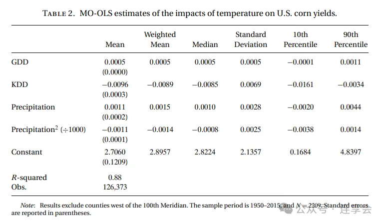 作者关注的并非天气对玉米产量的平均影响,而是基于个体水平的影响 。为了检验 MO-OLS 估计的准确性,作者首先使用传统的固定效应回归模型 (FE-OLS) 进行估计,并将 FE-OLS 和 MO-OLS 两种模型估计结果对比,发现当模型中存在与回归变量相关的多维斜率异质性时,MO-OLS 能够对系数做出有效且一致的估计,而传统固定效应模型则会产生有偏估计。