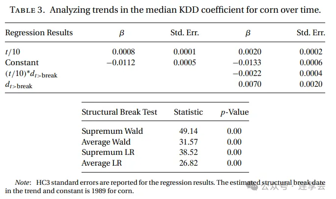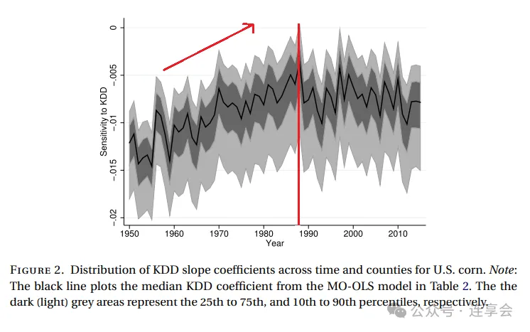 另外,作者还对每年的中位数系数进行了线性时间趋势回归,并检验了结构趋势的断裂,结果如表所示。分析表明,1988 年之前 KDD 系数呈正趋势,表明产量的热敏感性降低,支持适应性假设。然而,1989 年发生了一次重大突破,同时1988-89 年美国中西部经历了一场极端干旱。此后,KDD 系数的时间变化趋势变得微弱且不显著。2015 年的 KDD 系数中位数与上世纪 70 年代相似,表明在过去 40 年中,农产品在适应高温方面缺乏持续性进展。总体来看,KDD 系数在样本的前半段表现出强劲的上升趋势,表明美国玉米产量适应了 20 世纪 50 年代至 80 年代的高温。